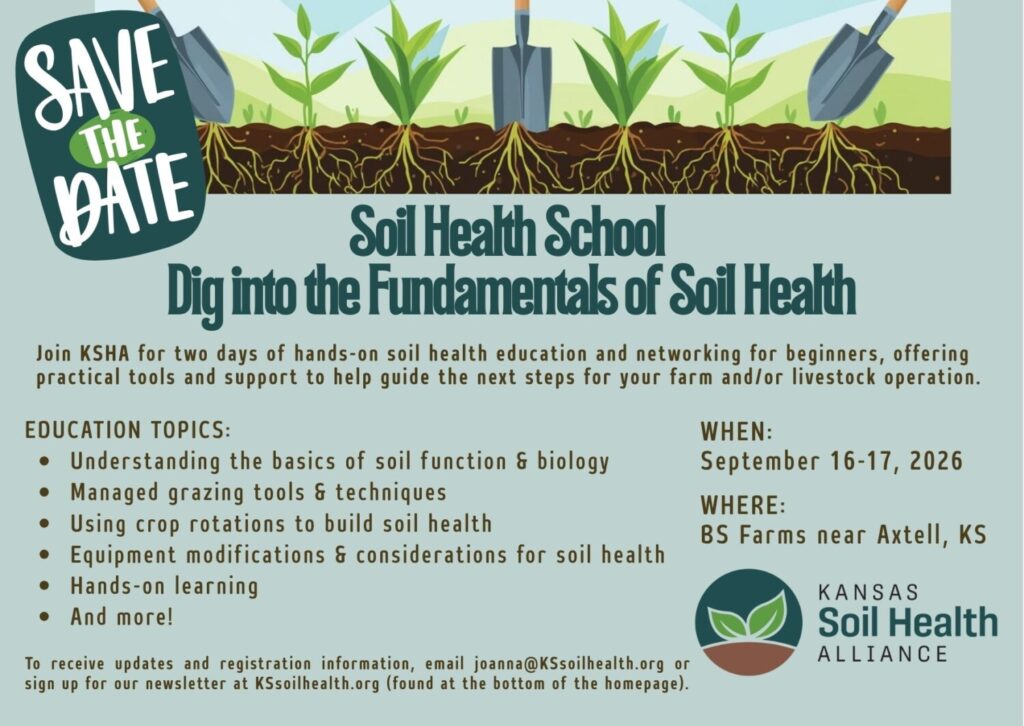 We’re hosting our first Soil Health School! Join the Kansas Soil Health Alliance for two days of hands-on soil health education and networking for beginners, offering practical tools and support to help guide the next steps for your farm and/or livestock operation.