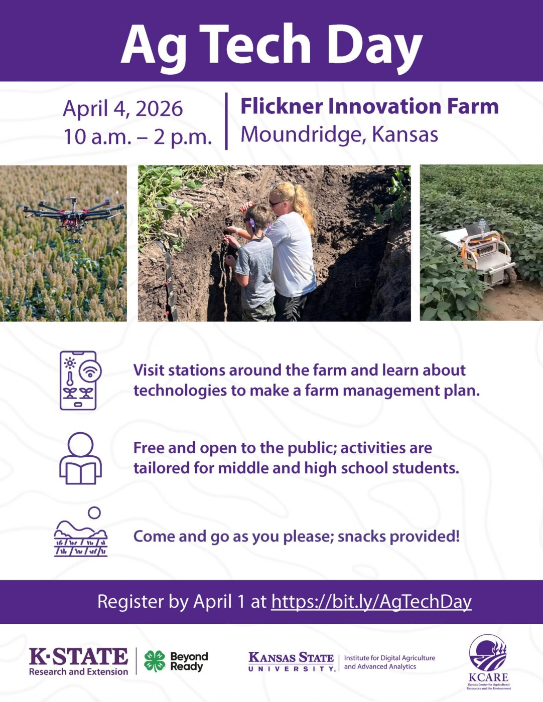 Flickner Innovation Farm 1923 Arrowhead, Moundridge, KS, United StatesCalling curious minds, especially those in grades 5-12!! Ag Tech Day is an opportunity for youth (and their families) to explore how technology is shaping modern agriculture. From drones and sensors to robotics and insect-tracking tools, participants will get an up-close look at both new and established technologies that help make farm management more efficient.…